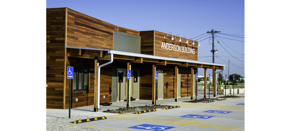 The Anderson Building is a central hub for events on the Lyon County fairgrounds for activities like 4-H, music events, boxing matches, and meetings. The existing facility had sufficient square footage for events but presented issues concerning inadequate restroom facilities, an aging, insufficient kitchen, and the lack of identity as a built space. BG Consultants worked closely with Lyon County staff to redesign the building, integrating its appearance with the nearby Clint Bower Building while also highlighting it as a unique marquee to the fairgrounds. The renovated Anderson Building utilizes a high quality wood rain-screen exterior for the main entry and two separate colored metal exteriors to create a dynamic entry point.
