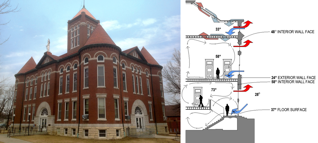 Anderson County Courthouse commissioned BG Consultants to perform a building envelope assessment. As functionality and performance of aging facilities is critical to continued optimal use, the County was looking for the best options to improve the building’s energy performance. BG architects evaluated exterior walls, attic space, doors, and windows to understand the envelope condition of the building relative to energy efficiency. They found that many elements of the building envelope, particularly the windows and doors, were well below energy code standards. Air infiltration due to lack of weatherproofing caused a drain on the heating and cooling loads required to maintain a satisfying interior environment, and in consequence, on the building’s energy consumption.