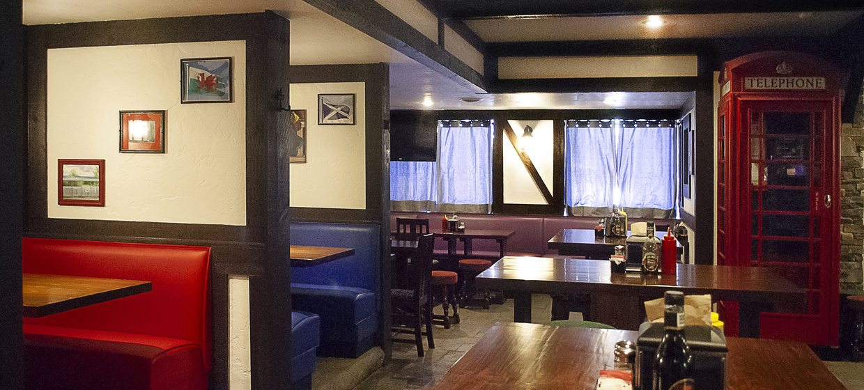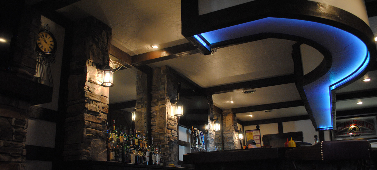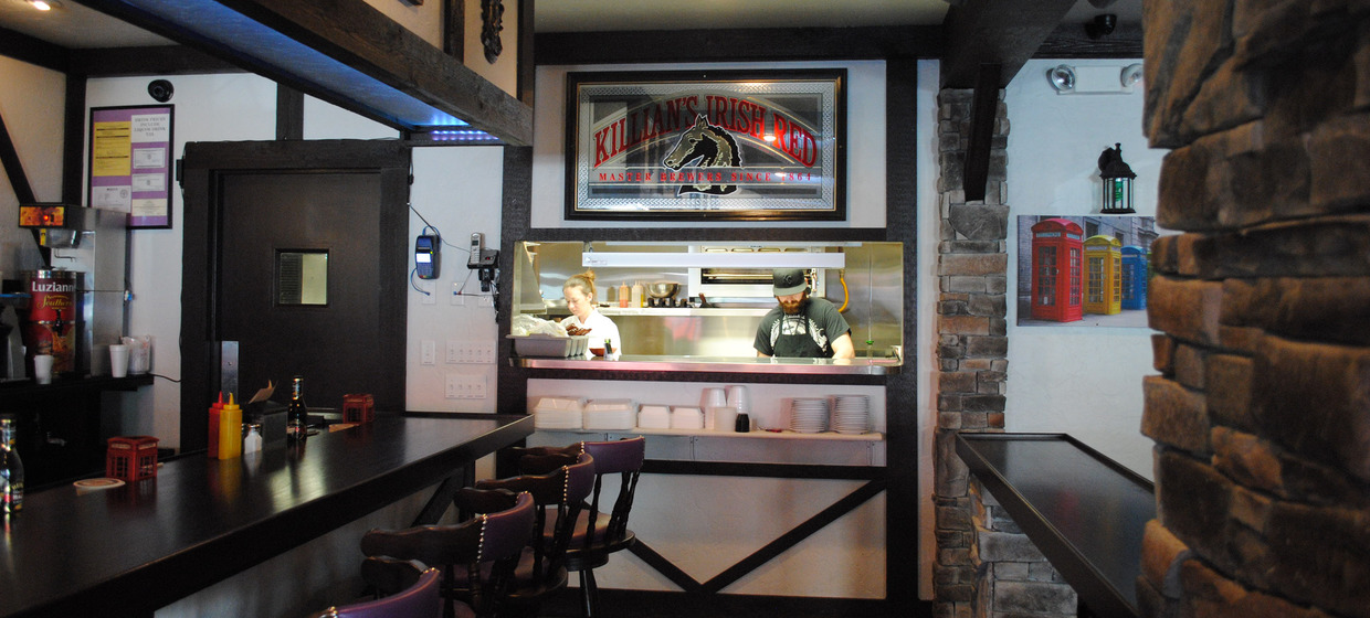 The restaurant was designed to feel like a wattle and daub English pub. It features textured panels bordered by wood trim to emulate half-timbered construction. Along the center of the restaurant is a large pseudo beam featuring stone columns and a standing bar which divides the space into dining and bar areas. The design is further articulated by pseudo columns behind the bar, columns at the dividing feature, and pseudo beams on the ceiling. Custom seating includes three dedicated booth tables and built-in seating along the north and west walls. The main feature in the restaurant is the custom bar, with a horseshoe inspired serving station, a lofted ceiling, and custom wood back bar.