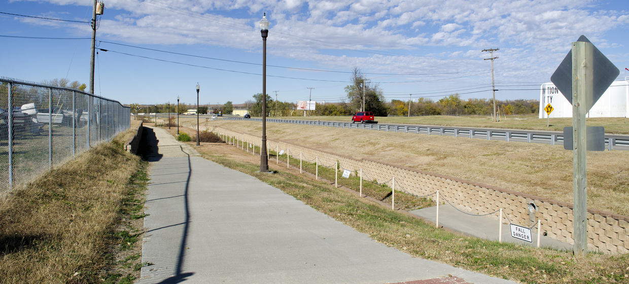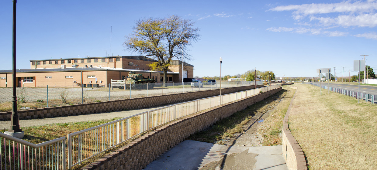 This major storm drainage channel is located near the northwest corner of Junction City along the west side of North Jackson Street (Highway K-57). The highway corridor provides new visitors a first impression of the City, but the existing road ditch had steep, weedy side slopes that were regarded as an eyesore and made maintenance difficult.