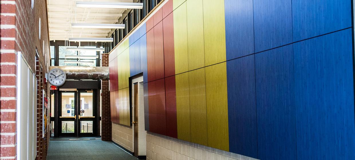 For the project, BG architects aspired to bring the learning environment to the entire facility and add flexibility and purpose to previously underutilized spaces. Because the school wanted their facility to have a strong connection between indoor and outdoor settings, BG explored daylighting and sought to naturally light core interior spaces. All classrooms within the school now experience either direct or borrowed daylight. The clerestory window that defines the hallway between the existing facility and the addition introduces natural light into core spaces and creates a more positive learning experience. A tilted wooden wall plane finished to a rhythm of primary colors was designed to enliven the hallway and invigorate students and faculty.