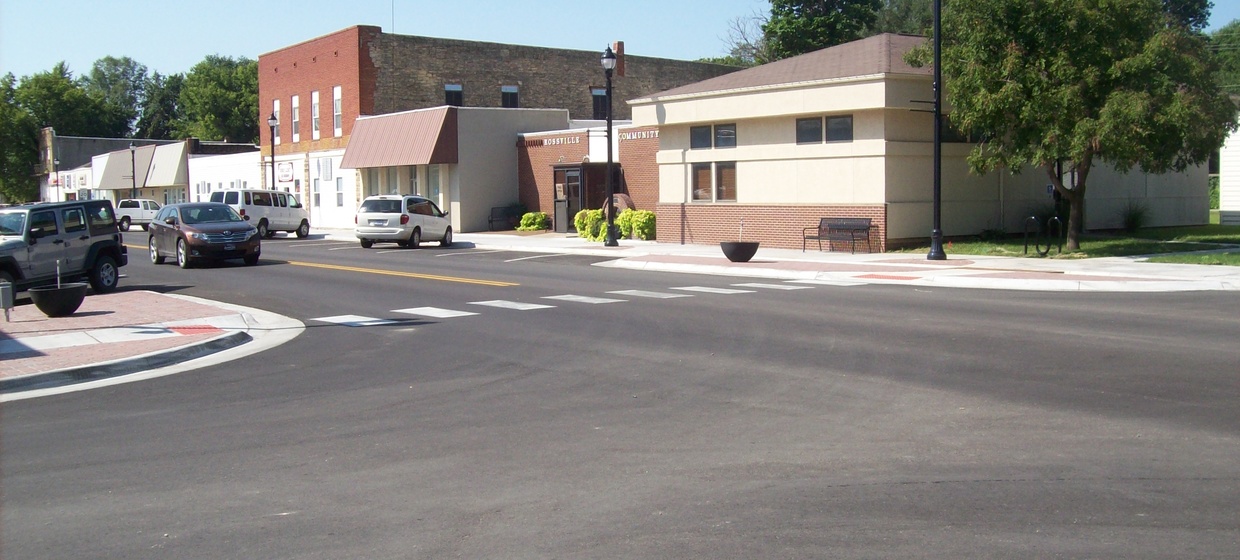 The City of Rossville obtained Transportation Enhancement funding through the Kansas Department of Transportation in 2013 to improve the public infrastructure in their downtown. Curbs and sidewalks were replaced, decorative street lighting with banner arms, flag holders, and an audio system was installed, brick paver inlays were installed in various patterns and locations, and street furniture was added to enhance the communities experience on Main Street. Upon completion of the Streetscape Improvements, Shawnee County’s Public Works Department performed a mill and overlay of the asphalt street pavement to complete the beautification efforts.