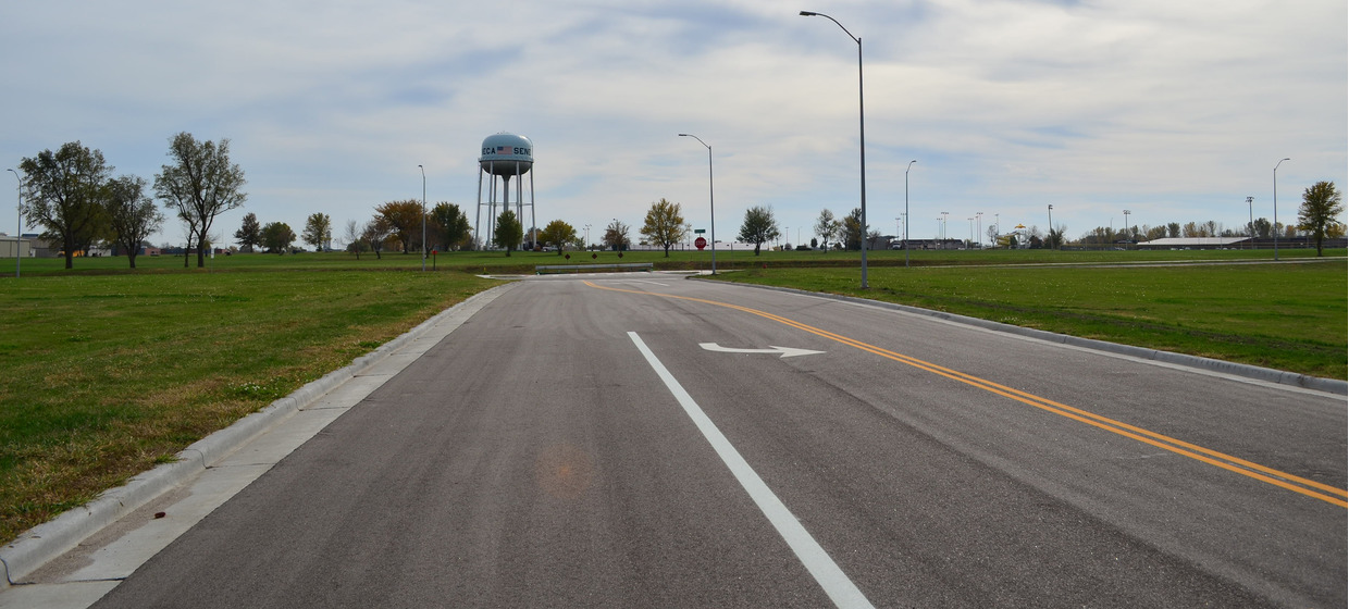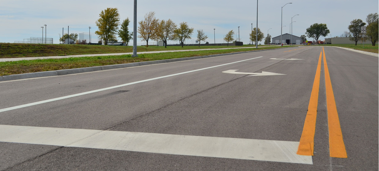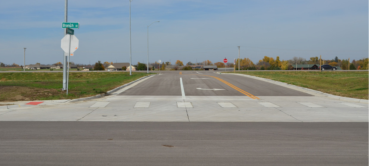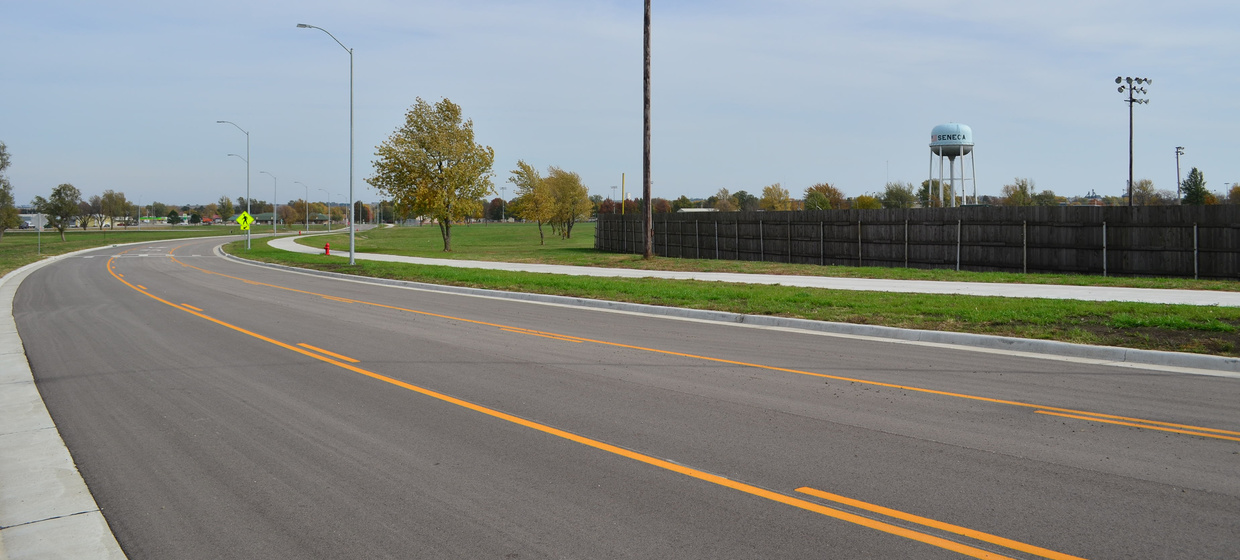 With changes to U.S. Highway 36 in Seneca, the Branch Street Extension project provides access to 11 city-owned commercial lots on the south side of the highway that otherwise would have lost direct northern access. The new asphalt surfaced collector street, named Branch Street, runs one-half mile between 11th Street and Community Drive. Left turn movements on Branch Street are accommodated with a two way left turn lane. Twenty-seven off street parking places were provided on both sides of Branch Street immediately west of 11th Street to accommodate existing businesses. A shared use path was constructed along the entire south side of Branch Street to connect to the City’s park and the nearby high school.